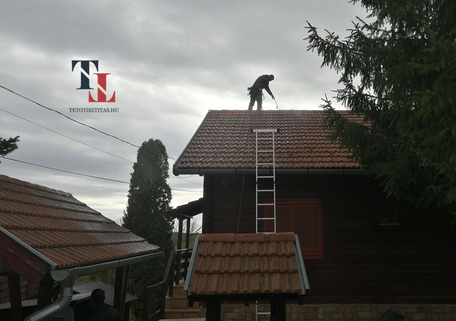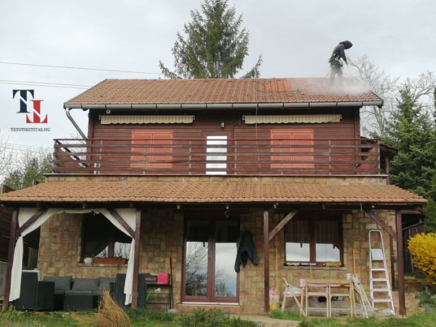 Felkérést kaptunk egy tóparti ház tetőtisztítására. A kerámia cserepek jellemzően jól kiállják az idő viszontagságait, viszont ehhez szükséges időnként lemosni őket. A tetőtisztítás során eltávolítjuk a mohákat és szennyeződéseket, így a cserepek élettartamát meg tudjuk hosszabbítani lényegesen olcsóbban, mint ha le kellene cserélni.